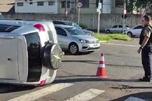Um automóvel marca Volkswagen e modelo CrossFox capotou no cruzamento da esquina com a Avenida Brasil.