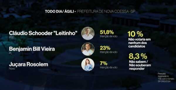 O ex-prefeito Benjamin Bill Vieira (PL) tem 23%, porcentagem 5,1% menor do que na pesquisa anterior, quando conseguiu 28,1% da preferência do eleitorado. Já a presidente da Associação Comercial de Nova Odessa, Juçara Rosolem (Novo) recuou 0,1% e tem 7% das intenções. Não votariam em nenhum dos candidatos 10%. Não sabem ou não responderam 8,3% dos entrevistados.